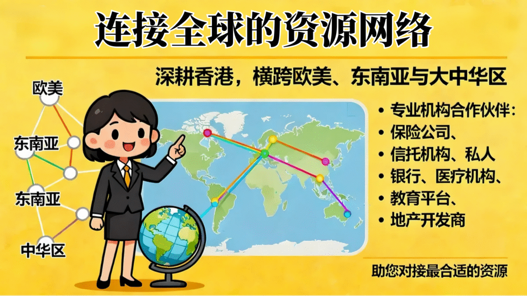 我們深耕香港,同時擁有橫跨歐美、東南亞與大中華區的專業機構合作夥伴,包括保險公司、信託機構、私人銀行、醫療機構、教育平台、地產開發商等,助您對接最合適的資源