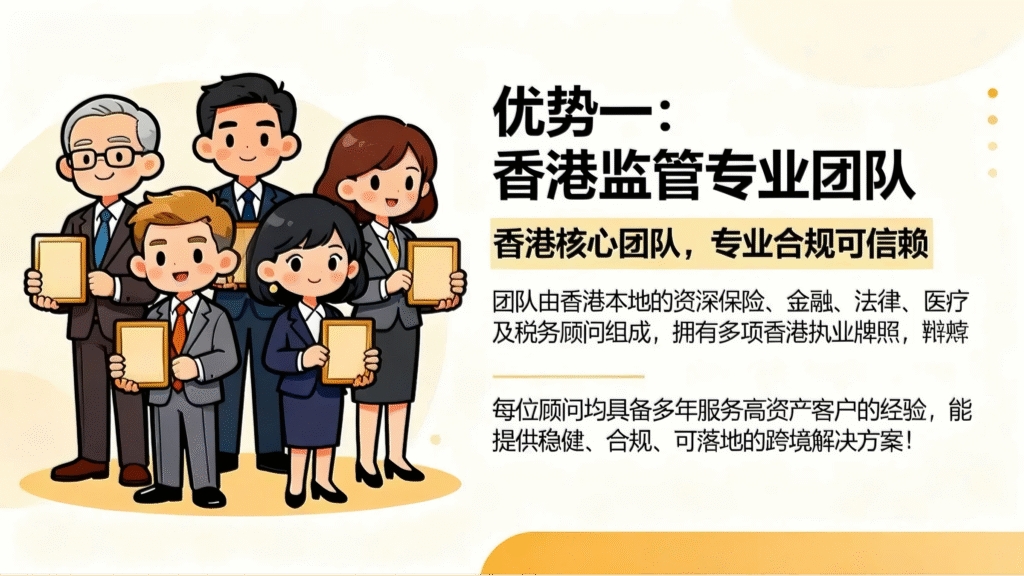 香港核心團隊,專業合規可信賴,團隊由香港本地的資深保險、金融、法律、醫療及稅務顧問組成,擁有多項香港執業牌照,並受香港機構嚴格監管