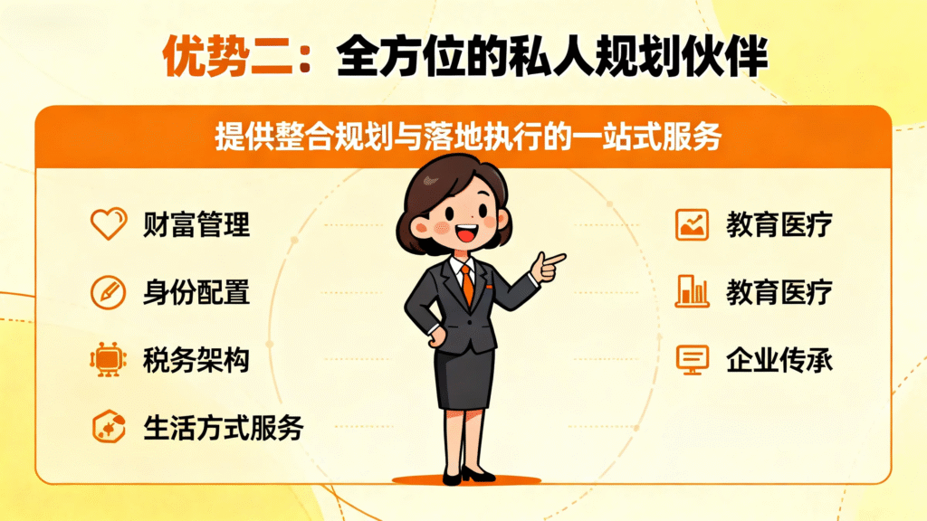 從財富管理、身份配置、稅務架構,到教育醫療、企業傳承與生活方式服務